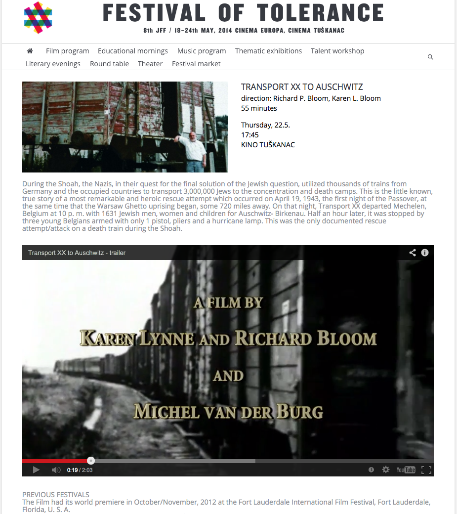 “Transport XX to Auschwitz” film screening – Festival of Tolerance | May, 2014, Zagreb, Croatia michelvanderburg 20140509 Published by michelvanderburg View all posts by michelvanderburg Published 20140509