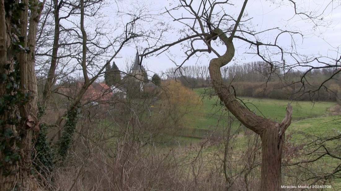 Kuttekoven track to Auschwitz… Right after the site where Simon Gronowski escaped from the 20th convoy, ‘Transport XX’, the railway bed of this former so-called ‘Fruitspoor’ (Fruit Track) crosses the village of Kuttekoven, with – on the horizon – the Church of Saint John the Baptiser , currently with the expo ‘Witzwart’ (Whiteblack) – aka Land(es)capes from the 20th Convoy – by the local photographer Jo Struyven.