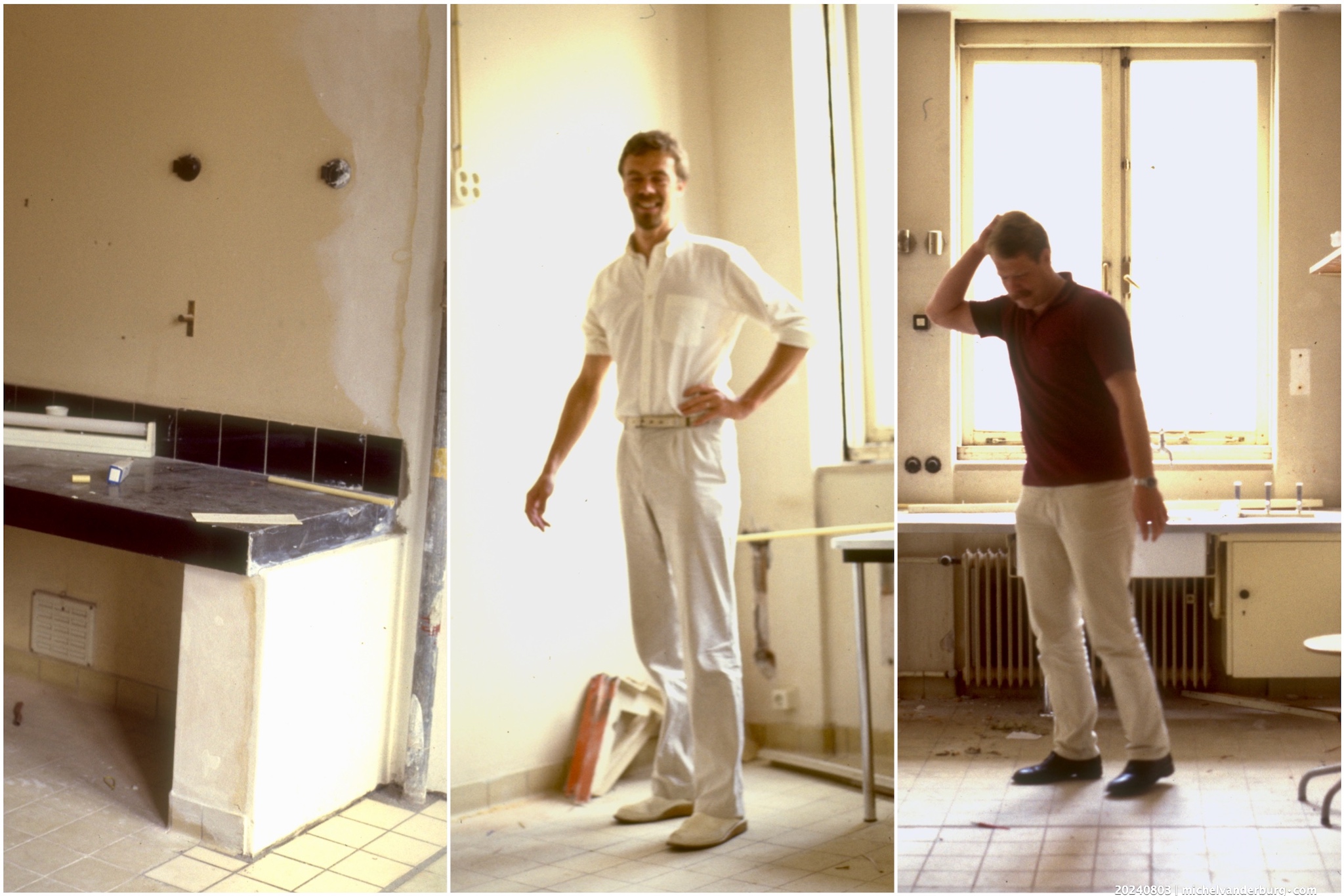 Summer 1985… start of our Leiden Islet Transplant Laboratory by Paul van Suylichem (right) and Michel van der Burg (middle), both from the Surgery department — wondering how to start here our islet lab in this space – a former weighing chamber (left : stable weighing table) made available by the Cell Biology department of the Leiden University, headed by Prof J.P. Scherft. Where to put our equipment… the laminar flow cabinet, large centrifuge, fridge, freezer, shaking waterbath, microscopes, and a lot of disposables coming ?