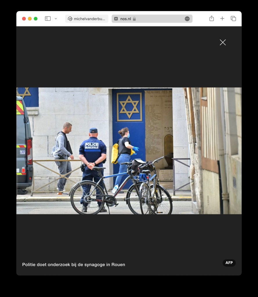 Update 20240517 – 2217 CET : Noticed that (i) NOS site post has been updated last at 16:18 CET ; and image has been replaced with actual news image (caption : Police investigations at the Rouen synagogue | dutch : Politie doet onderzoek bij de synagoge in Rouen )