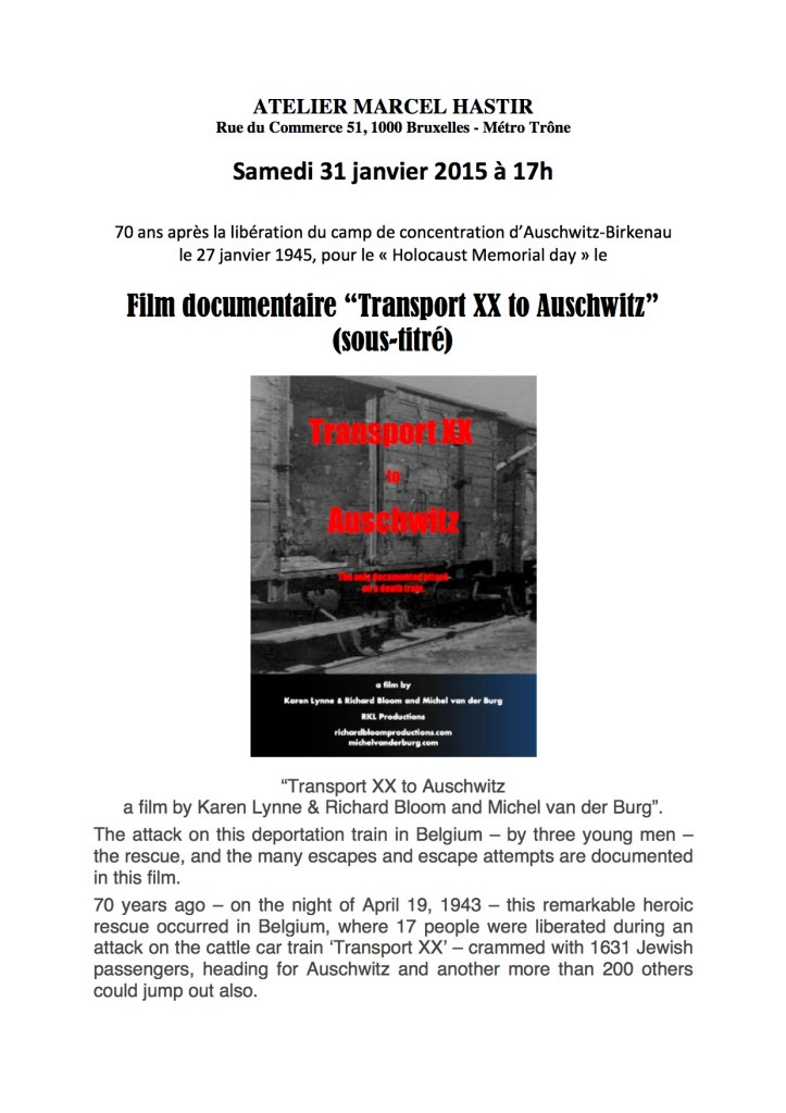 On the occasion of Holocaust Memorial Day the Atelier especially draws your attention to the screening of the documentary film “Transport XX to Auschwitz” – a film by Karen Lynne & Richard Bloom and Michel van der Burg” (subtitled) on Saturday January 31, 2015 at 17h in the Atelier Marcel Hastir at the Rue du Commerce 51 in Brussels, Belgium