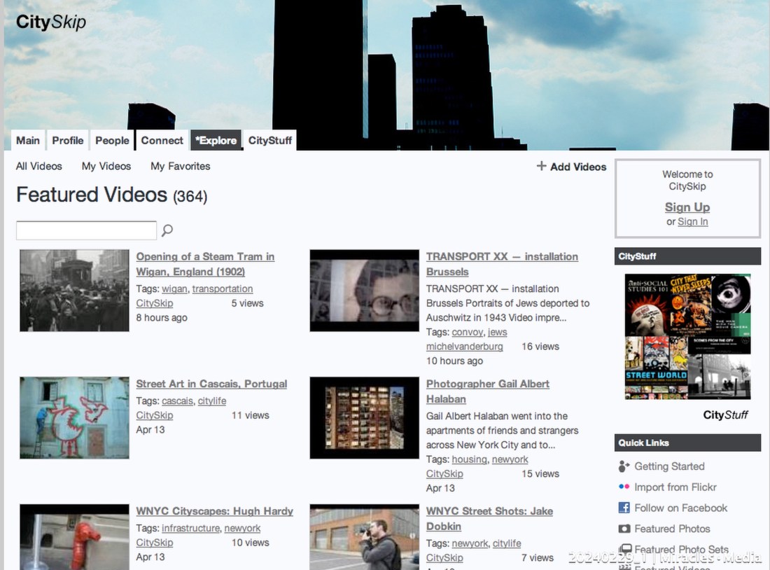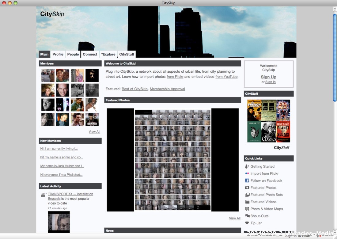 CitySkip was one of the Web 2.0 communities – a network about all aspects of urban life, from city planning to street art, a forum for “cool people who dig cities” for posting messages, sharing photos and videos – at Ning.com in addition to the mainstream social networks MySpace, Facebook, YouTube. It existed from 2007 untill February 2010.