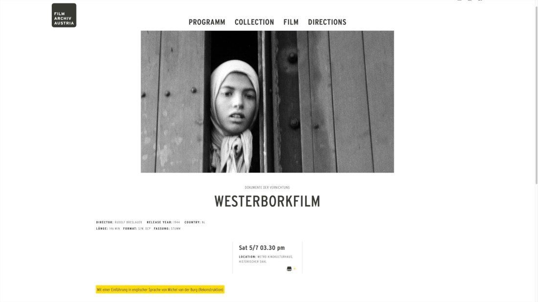 The Westerbork film, May 7, 2022 at the symposium DOKUMENTE DER VERNICHTUNG of the Jüdischen Filmfestival Wien , the Mauthausen Memorial , and Filmarchiv Austria.