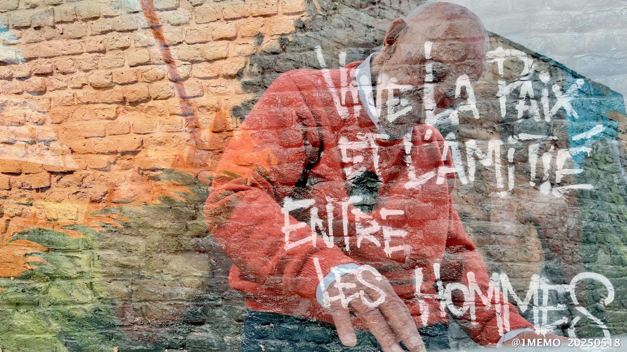 Unveiling of the street art mural created by HYER, a tribute to Simon Gronowski in the Garden of Remembrance , S2J School Center (Jardin du Souvenir et de la Mémoire , Centre Scolaire S2J) , Liège, Belgium, Saturday 17 May 2025.
