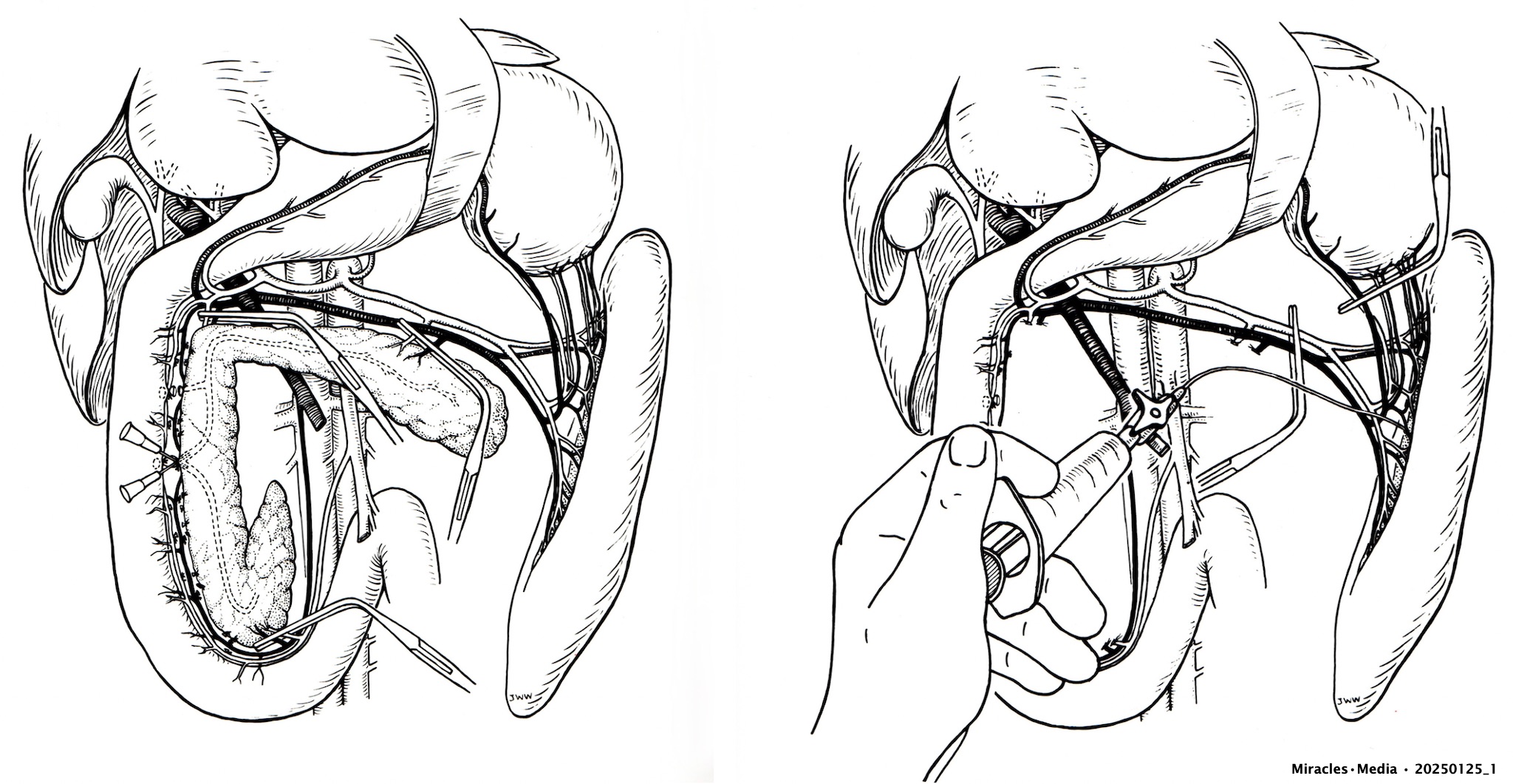 Autotransplantation of islets in the spleen • Michel van der Burg • Miracles.Media • @1MEMO 20250125_1 • Left : Canine pancreas with two cannulas in the pancreatic ducts (for infusion of collagenase solution) , with the blood vessels clamped at the time of removal of the gland. Not shown here : After removal of the gland the collagenase solution is infused , and the pancreatic islets are isolated within a few hours. Right : Next the purified islets are returned by infusion in the spleen of the same animal (auto-transplantation). Drawings by medical artist J. Wetselaar-Whittaker — with my hand posing for the injection drawing 😉 • TakeNode da74e6a2-e21d-4690-afe5-356949221658