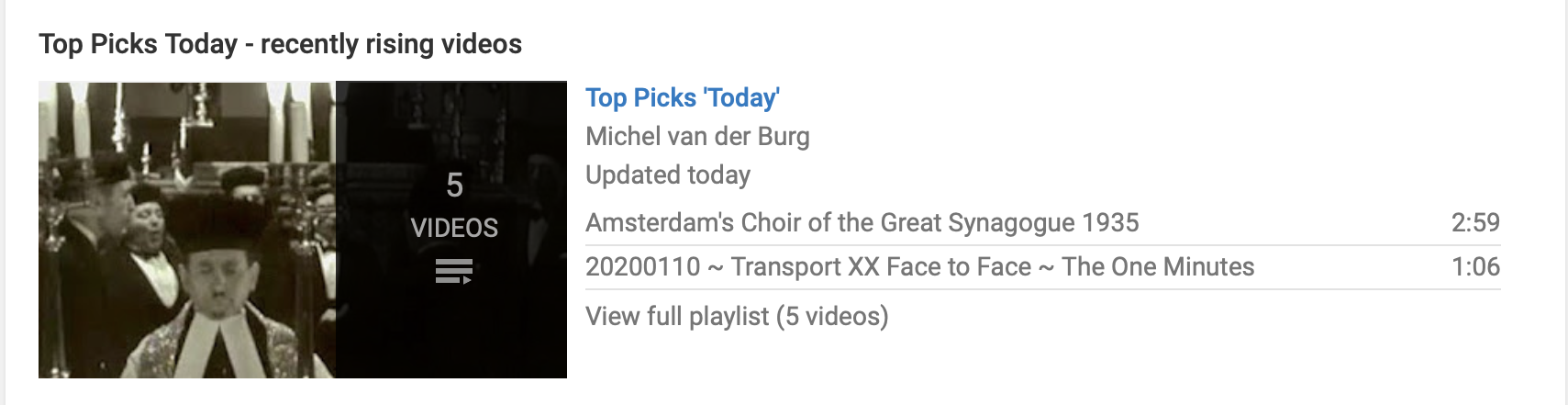 Or the full Westerbork film staying in the top 3 or 4 best viewed videos of this YouTube channel lately. Link https://www.youtube.com/playlist?list=PL_SggYHVHwj3ndl_2ZD36ISAvXVUkBeis
