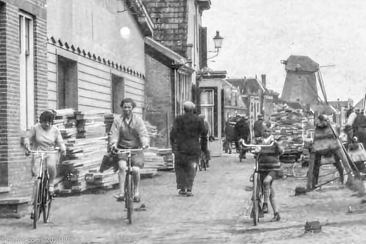 EN – Confusing in this historical picture…those bare female legs on the bicycle ! While looking for another picture of the De Schoone Haas windmill from the paper factory along the Gouwe in Waddinxveen, I found a photo in the archives of the SAMH museum in Gouda with the mention ‘Freight ship in front of the Alblas timber trade, windmill in the background, after 1905.’ — above (20231210_1) an edited version with sharpening, and brightness adjustments.
